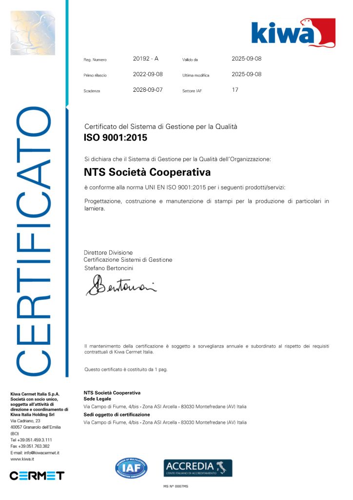 Il giorno 8 settembre 2022 la nTS Società Cooperativa ha ottenuto la Certificazione del proprio sistema di gestione per la Qualità secondo la norma UNI EN ISO 9001: 2015. Il certificato è stato rinnovato l’8/9/2025.